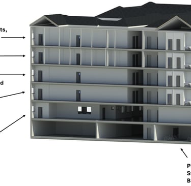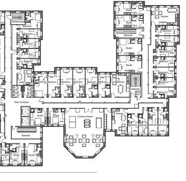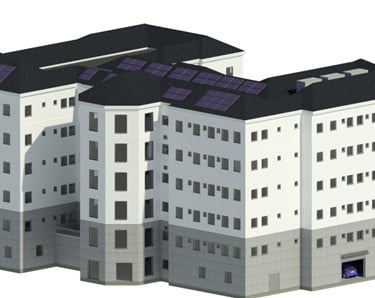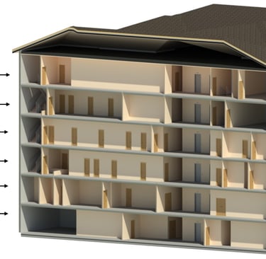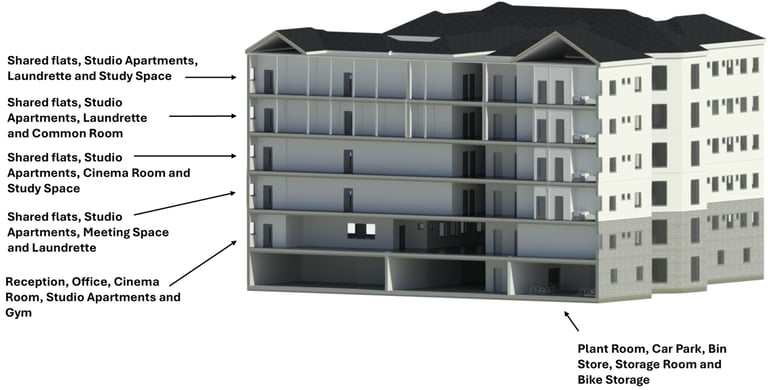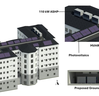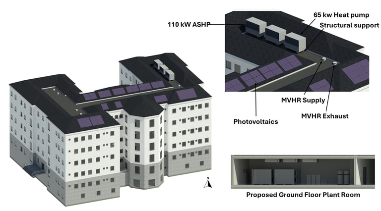 Based on these findings, I developed a fabric-first, sustainable refurbishment proposal to convert the building into high-quality student accommodation. The design prioritised envelope upgrades, a redesigned and improved internal layout to maximise cross ventillation and daylight, as well as the integration of low-carbon renewable technologies, including ASHPs, Solar PV, MVHR and a battery energy storage system.